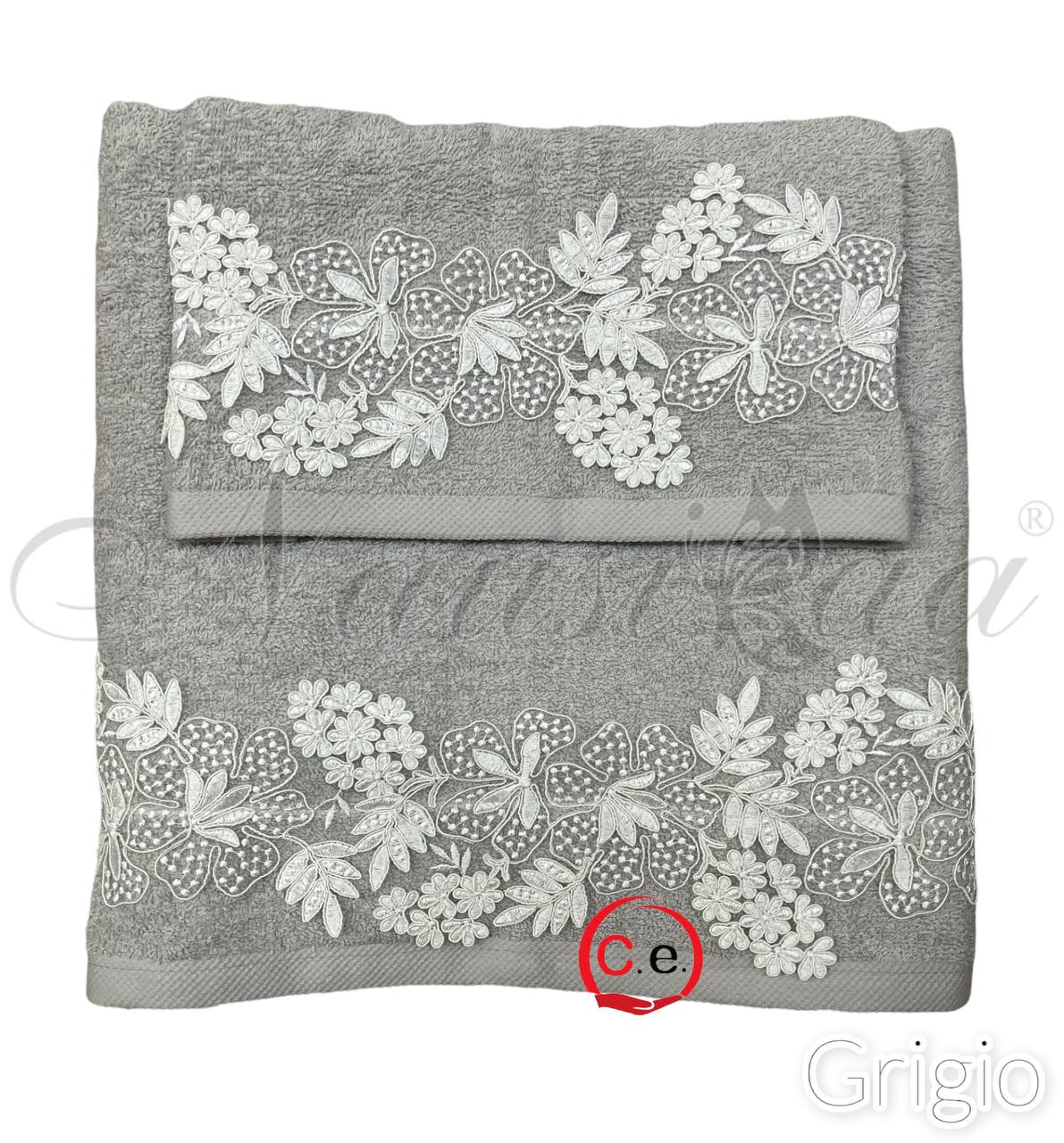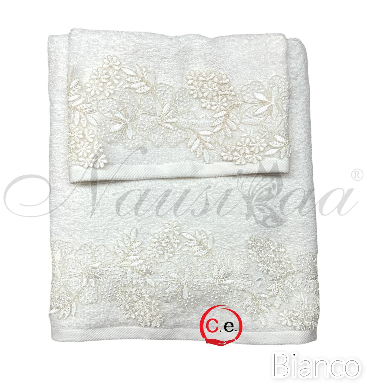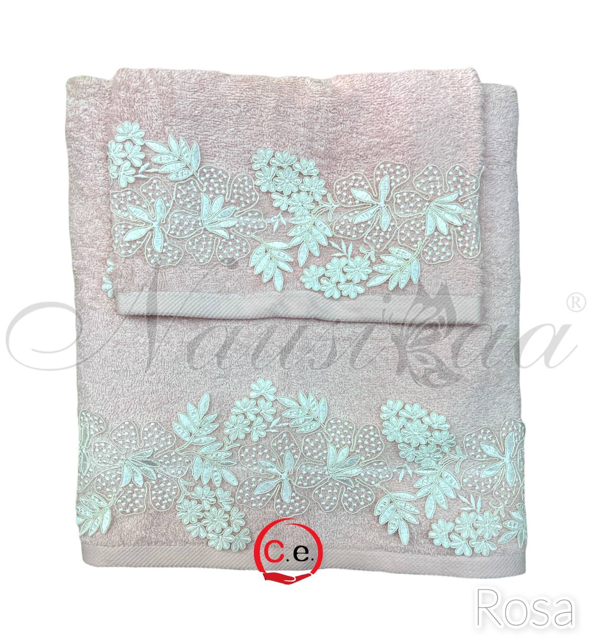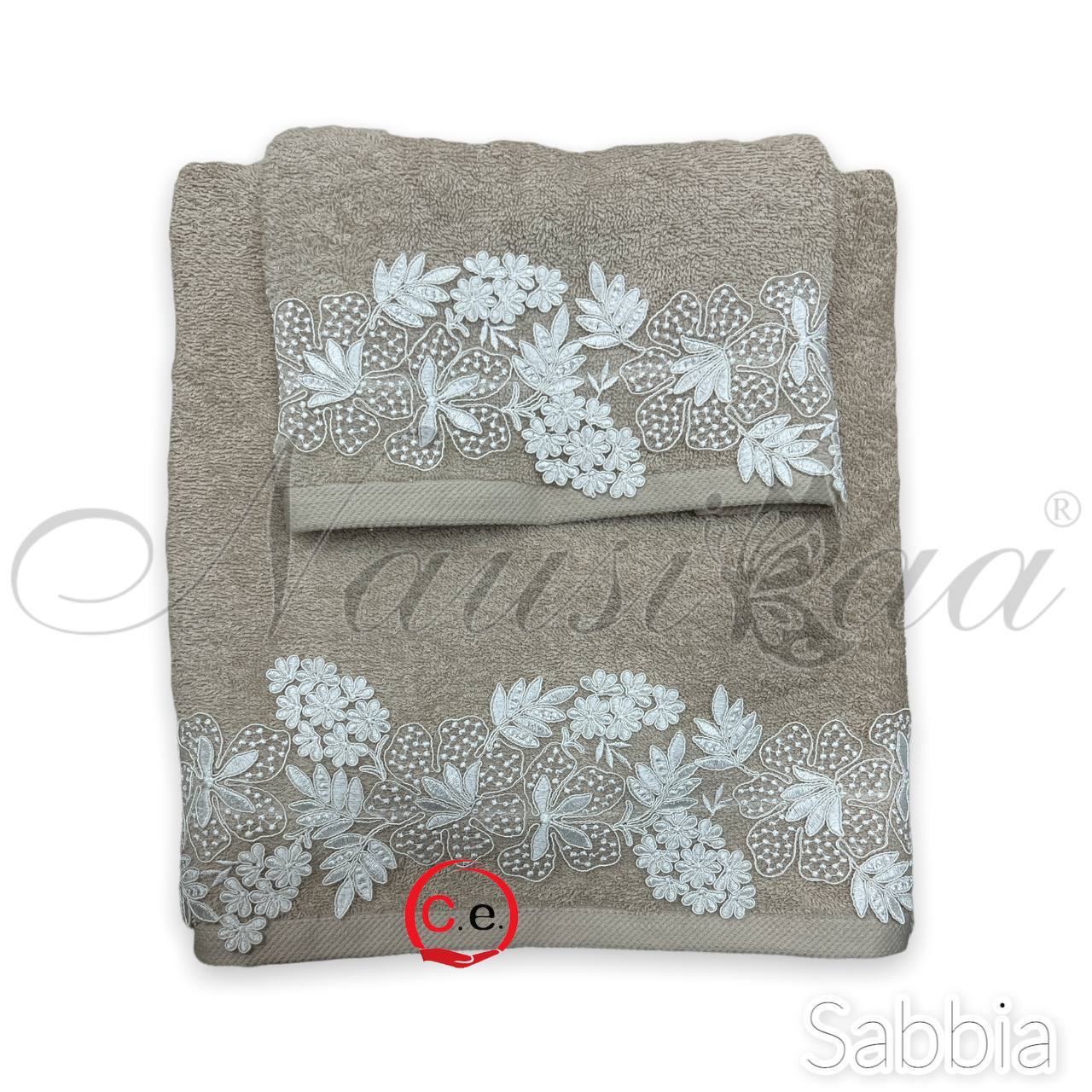 Asciugamani 1+1 Nausicaa art.Gloriana con pizzo lavorato, ricamato in Rebrodè