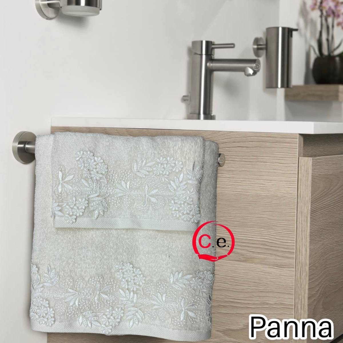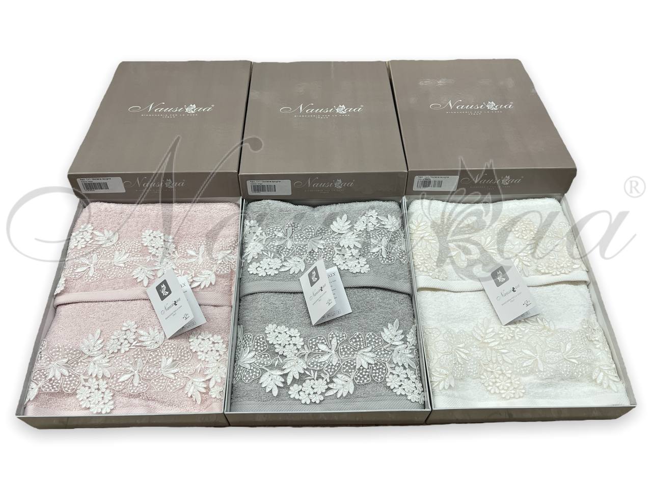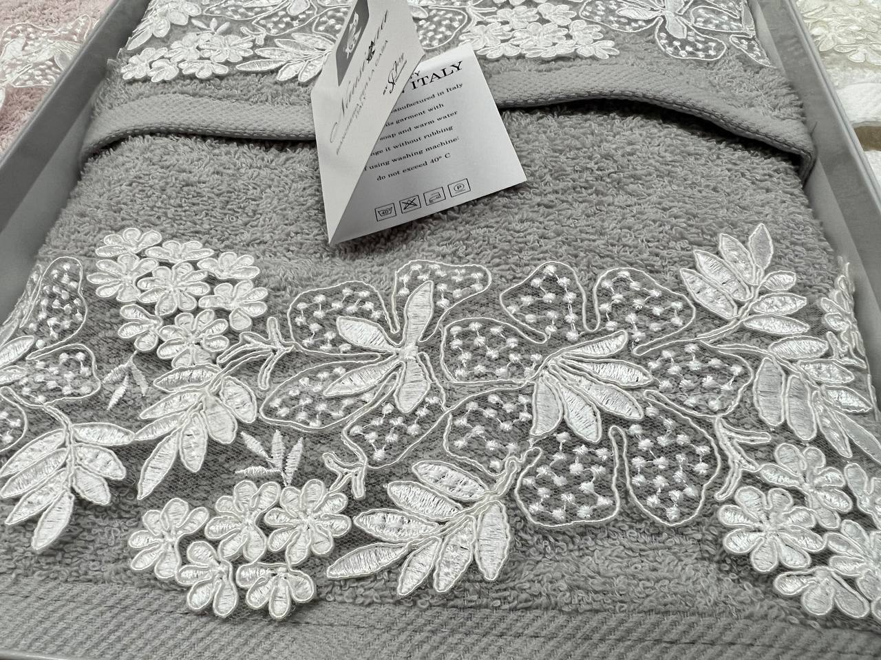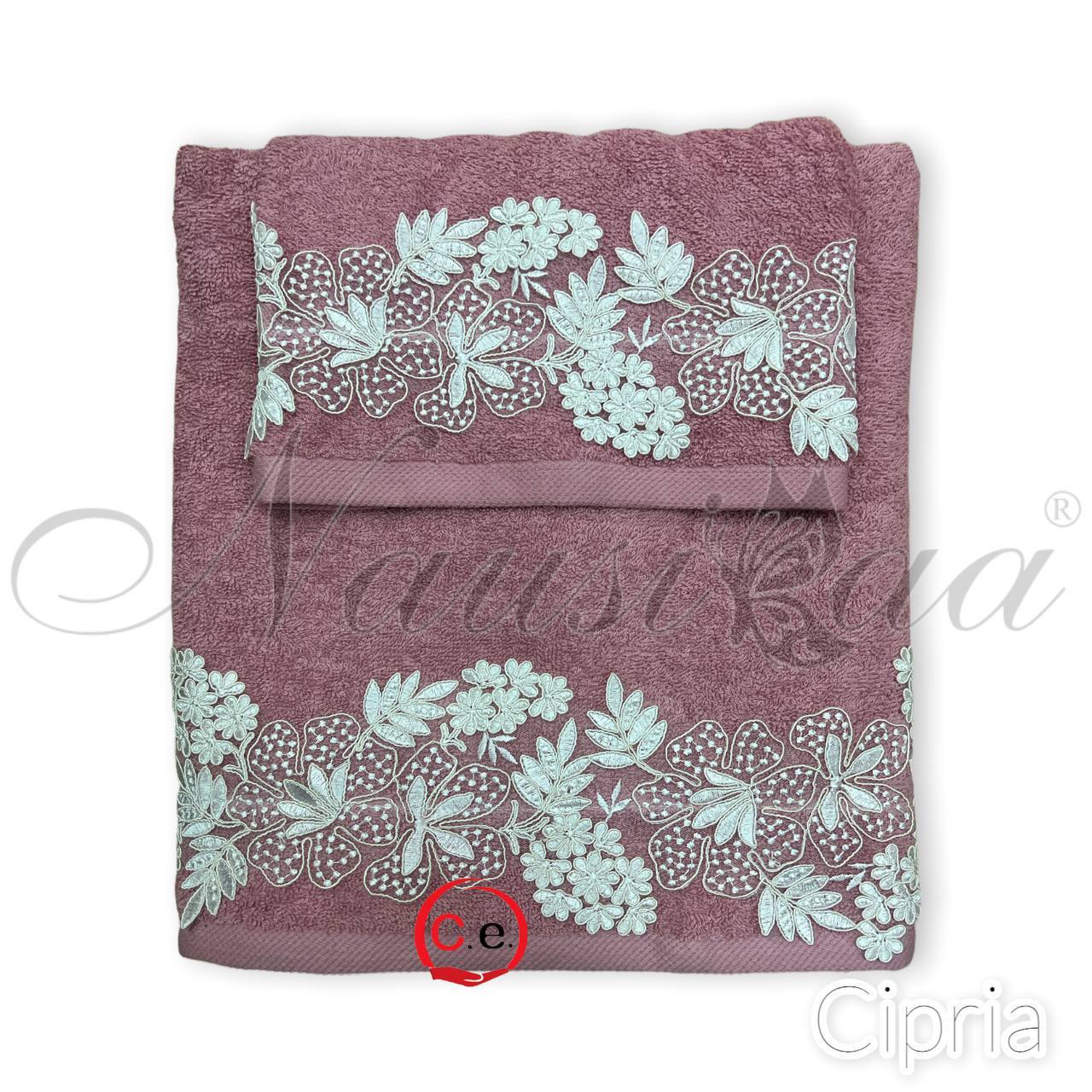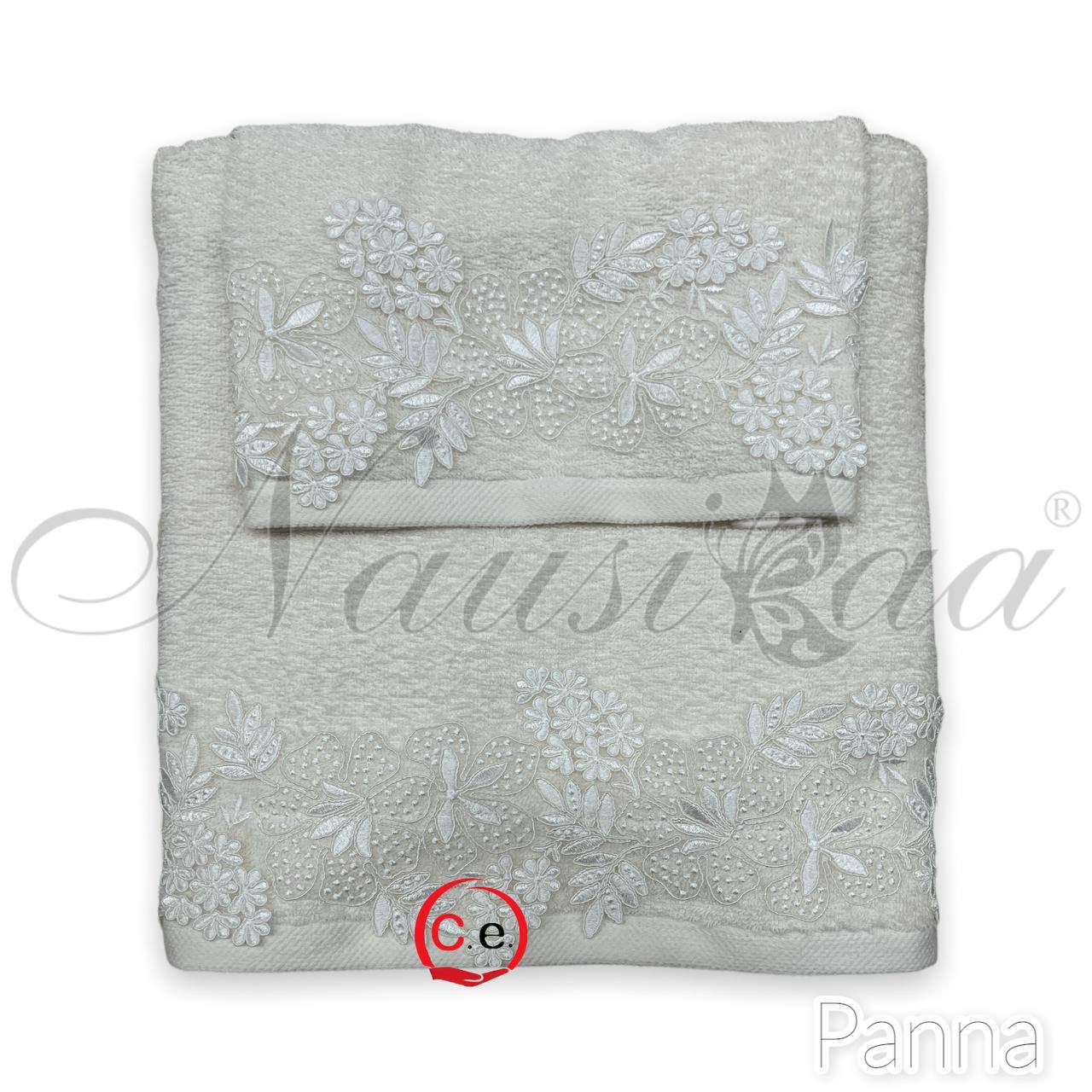 Asciugamani 1+1 Nausicaa art.Gloriana con pizzo lavorato, ricamato in Rebrodè