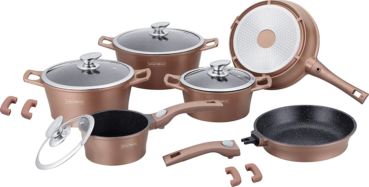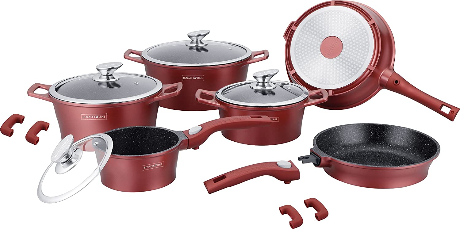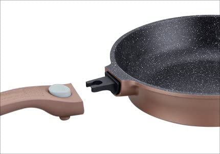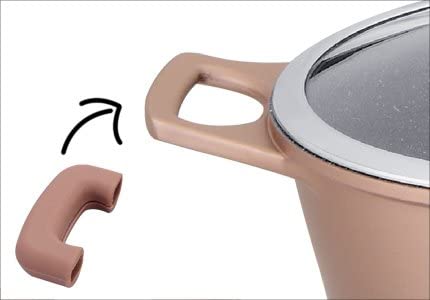 1 pezzo Padella 24 x 6.5cm con manico estraibile + 1 pezzo Padella saltapasta diametro 28 x 6.5cm con manico estraibile + 1 pezzo Casseruola diametro 28 x 14 cm con coperchio + 1 pezzo Casseruola diametro 24 x 14 cm con coperchio + 1 pezzo Casseruola diametro 20 x 10cm con coperchio + 1 pezzo Casseruola con manico diametro 16 x 8cm con coperchio + 4 pezzi manici in silicone removibili
