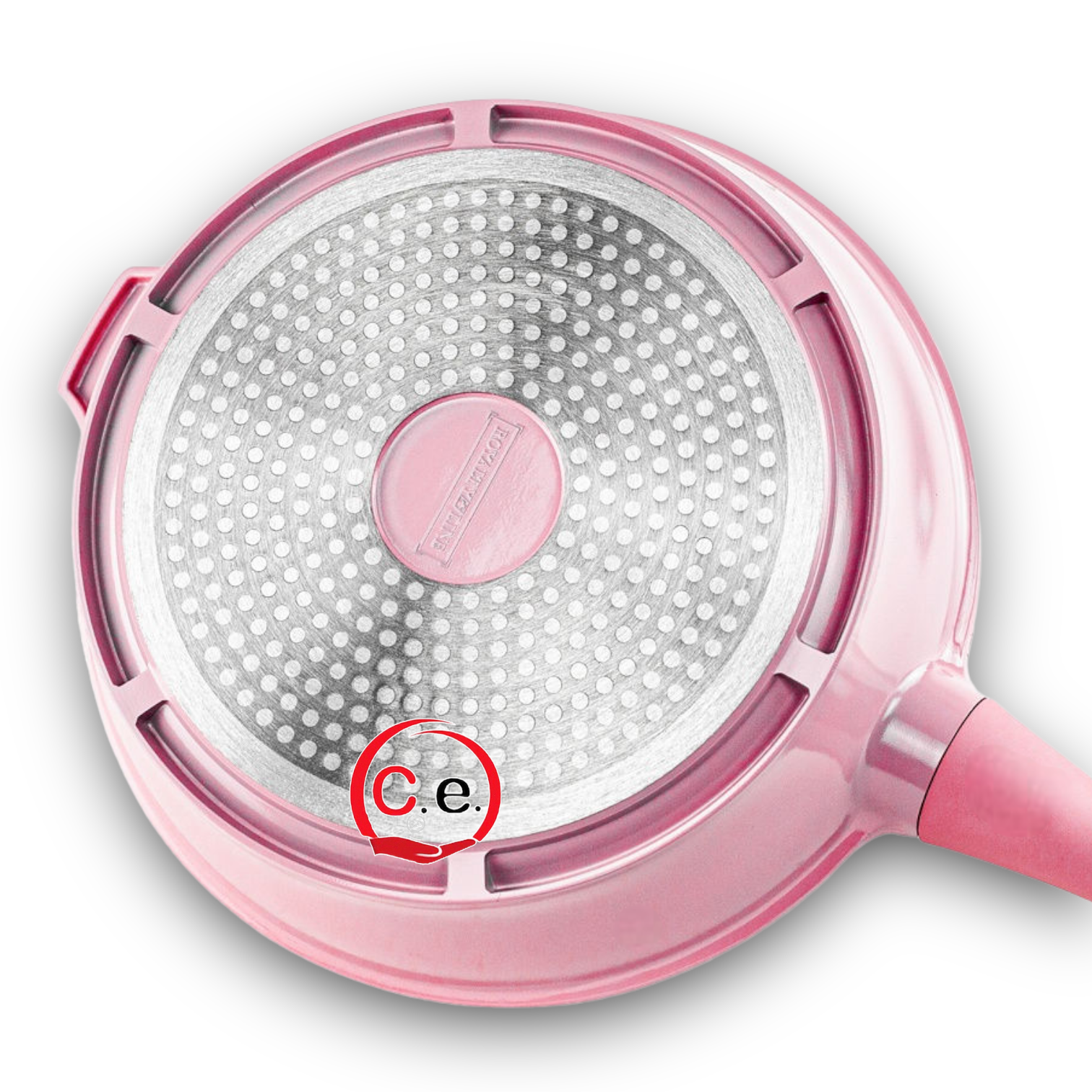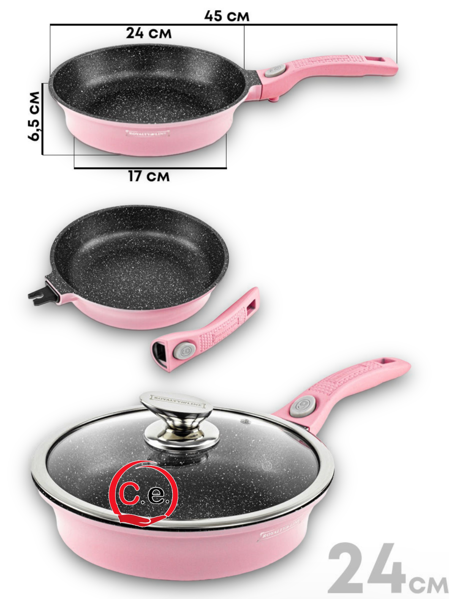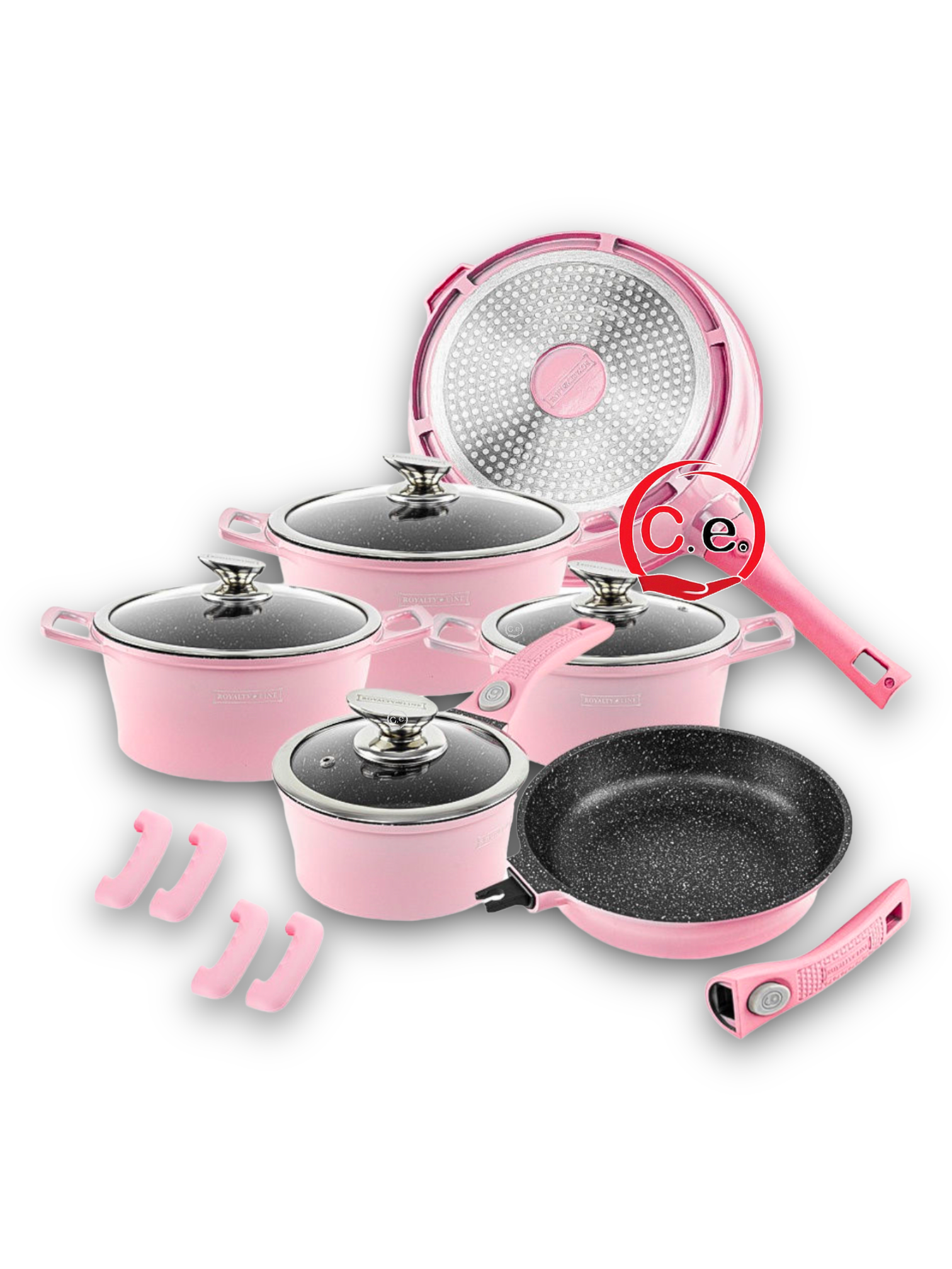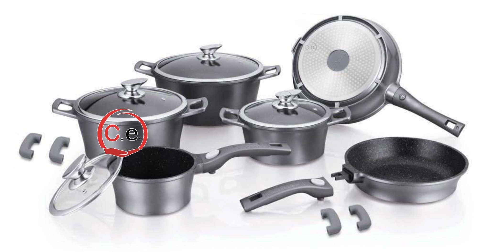 Composizione batteria: 1 pezzo Padella 24 x 6.5cm con manico estraibile + 1 pezzo Padella saltapasta diametro 28 x 6.5cm con manico estraibile + 1 pezzo Casseruola diametro 28 x 14 cm con coperchio + 1 pezzo Casseruola diametro 24 x 14 cm con coperchio + 1 pezzo Casseruola diametro 20 x 10cm con coperchio + 1 pezzo Casseruola con manico diametro 16 x 8cm con coperchio + 4 pezzi manici in silicone removibili