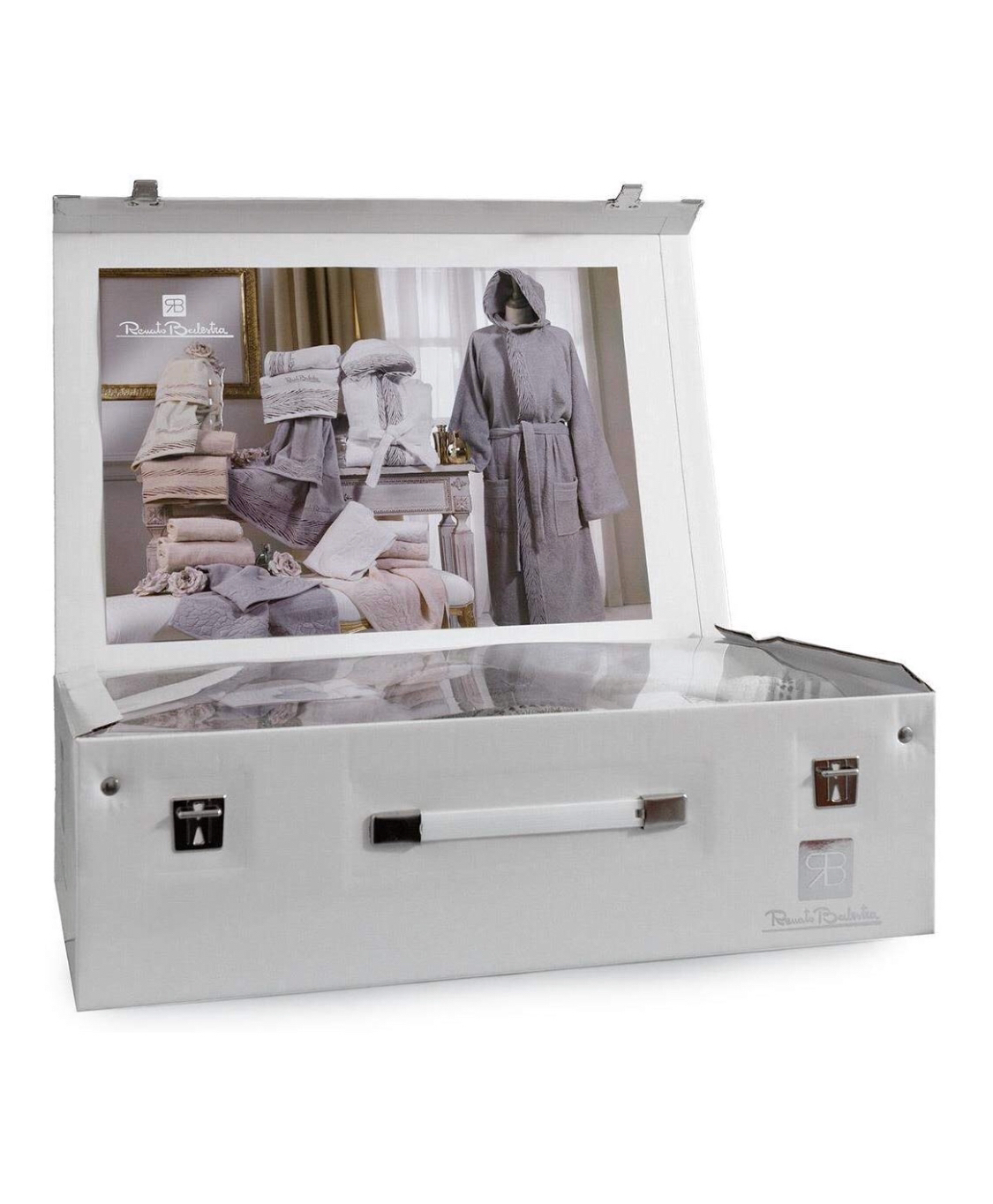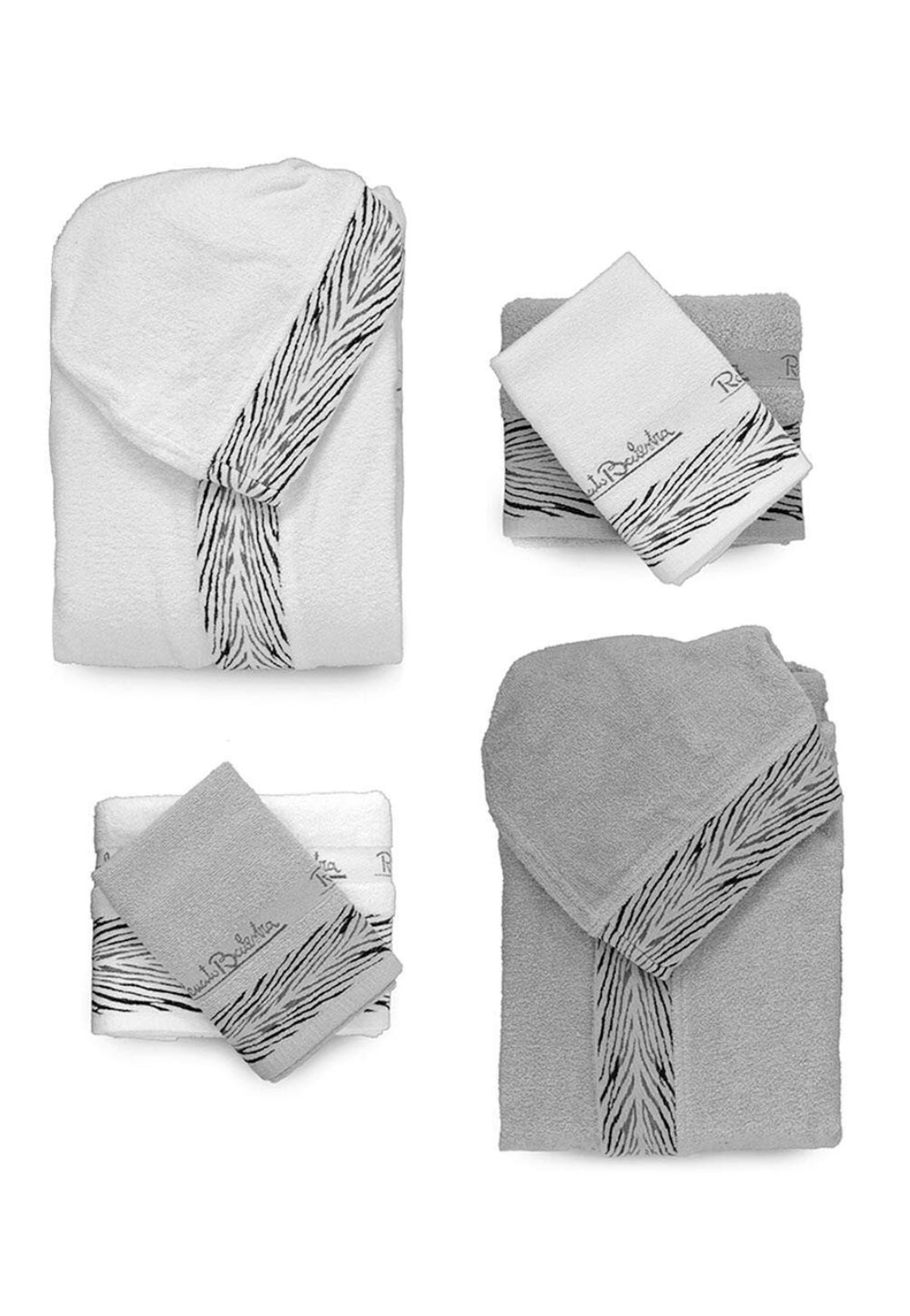 Pratico ed elegante completo bagno per Lui e per Lei marcato Renato Balestra, materiali morbidi e piacevoli al tatto. Ottimo per i tuoi momenti di relax o semplicemente per la tua cura del benessere.