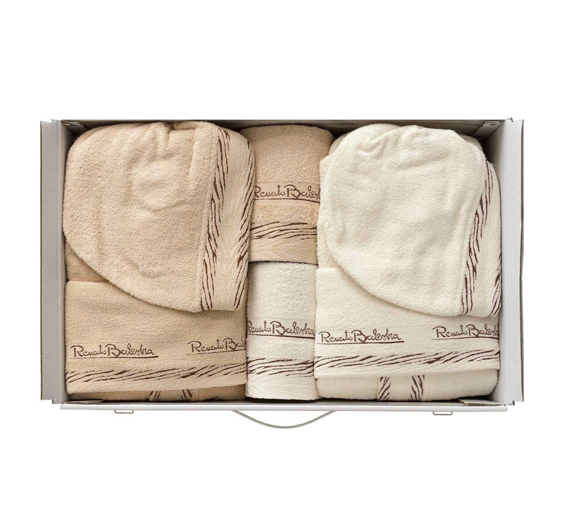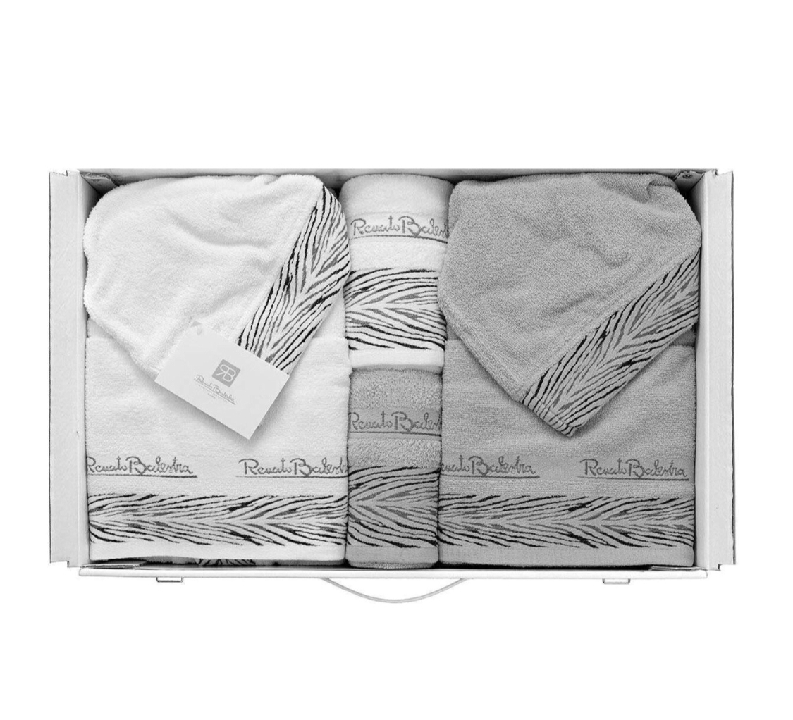 2 asciugamani ospite  Morbida spugna di cotone naturale Bordo decorativo zebrato  Ricamo logo Renato Balestra  Certificato di garanzia e qualità Articolo contenuto all’interno di un’elegante scatola in cartone rigido