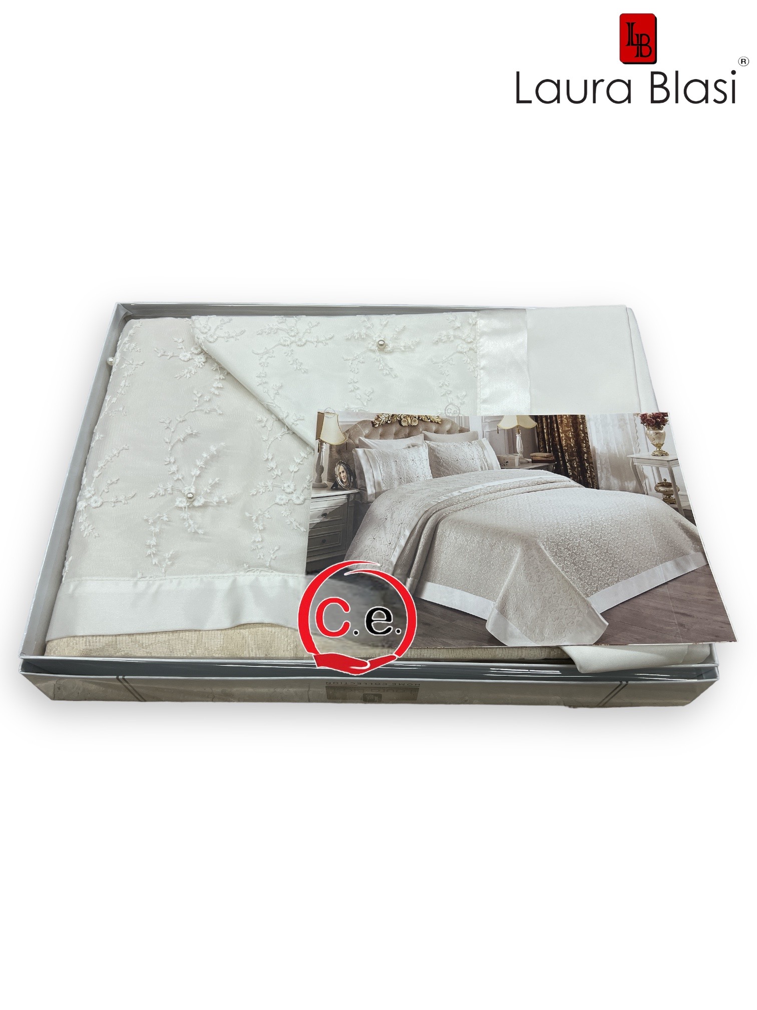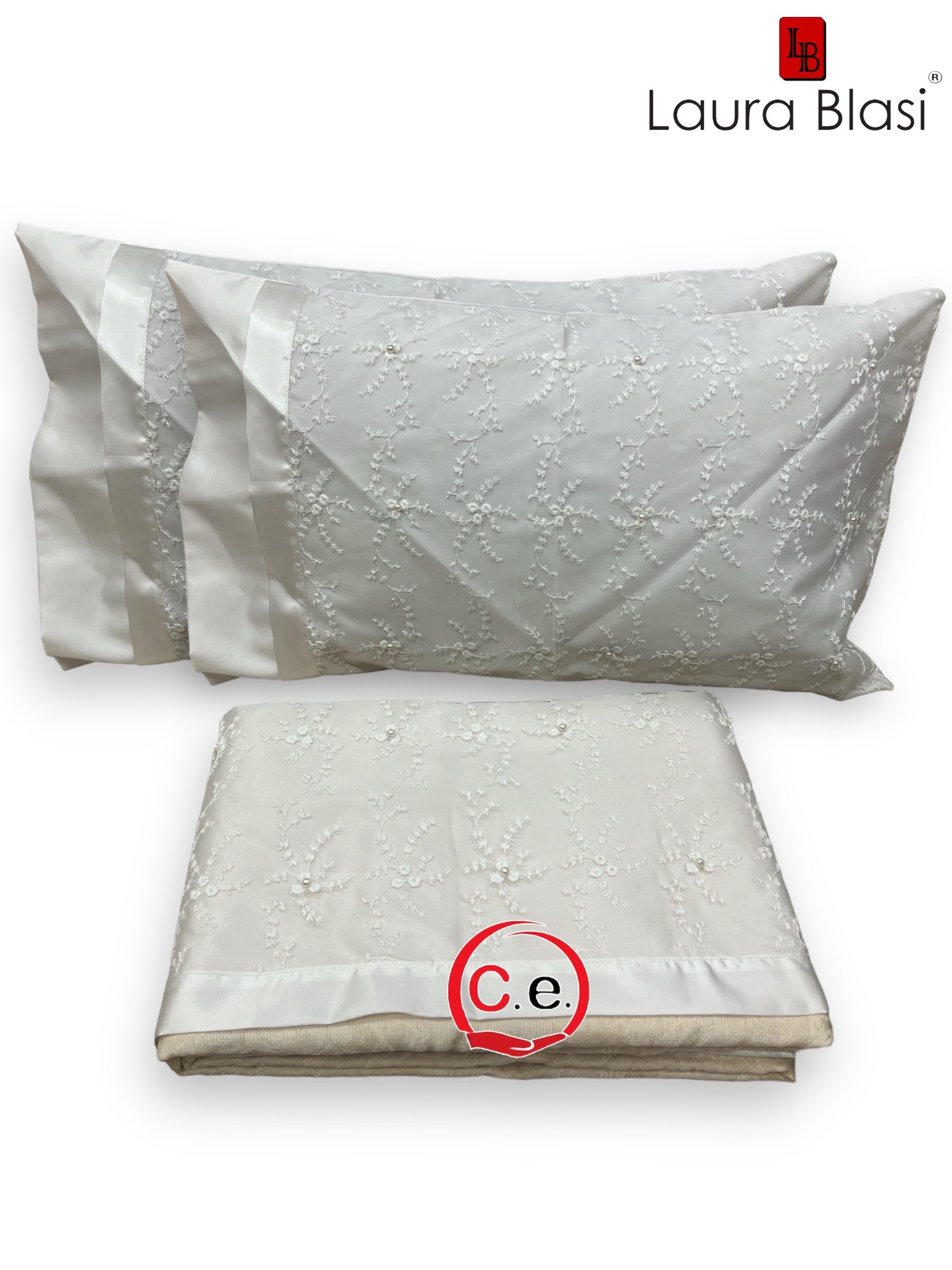 Fine tessuto ricamato con organze & perline applicate, il copriletto porta il ricamo sia sul copriletto che sulle federe per guanciali coordinate che troverete all interno.