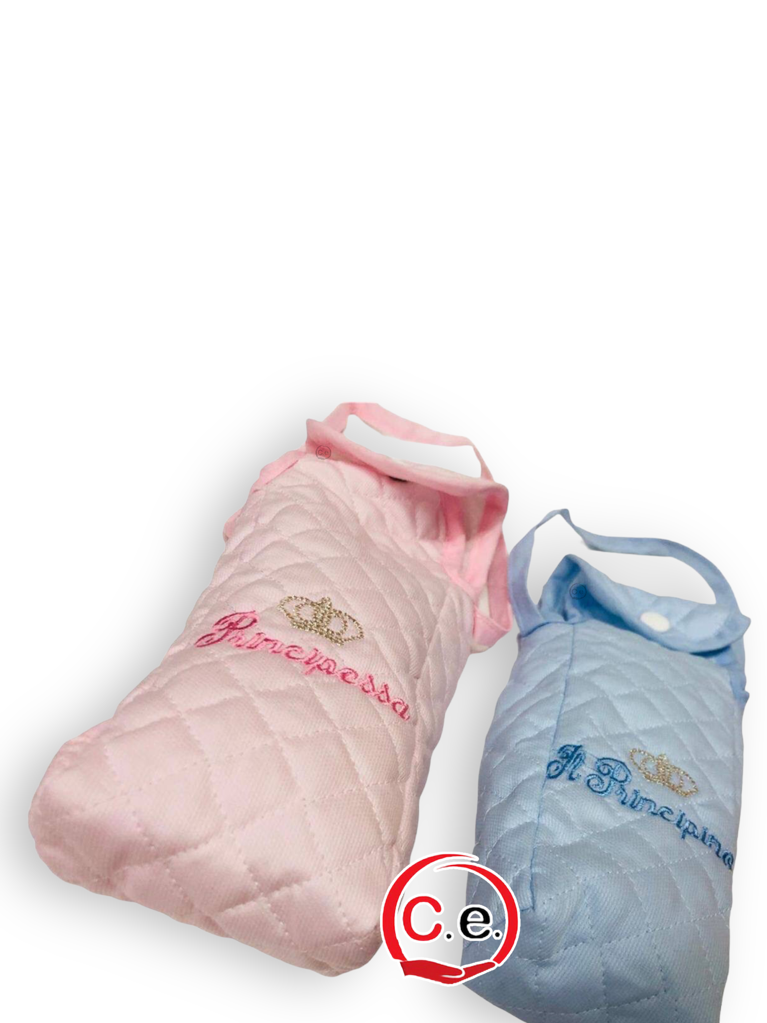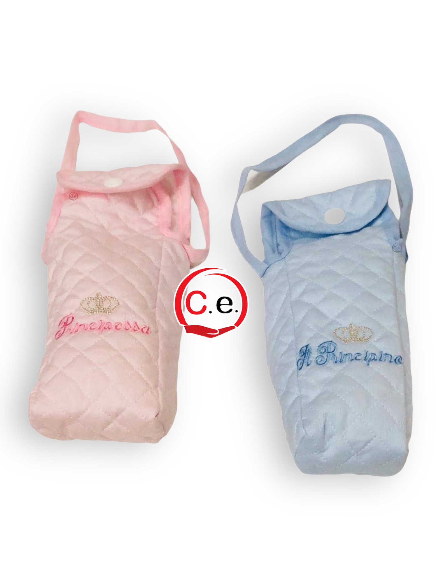 Il porta Biberon è disponibile in versione maschile che presenta una scritta sulla parte frontale “Principino” ricamata, e in versione femminile  che presenta una scritta sulla parte frontale “Principessa” ricamata.