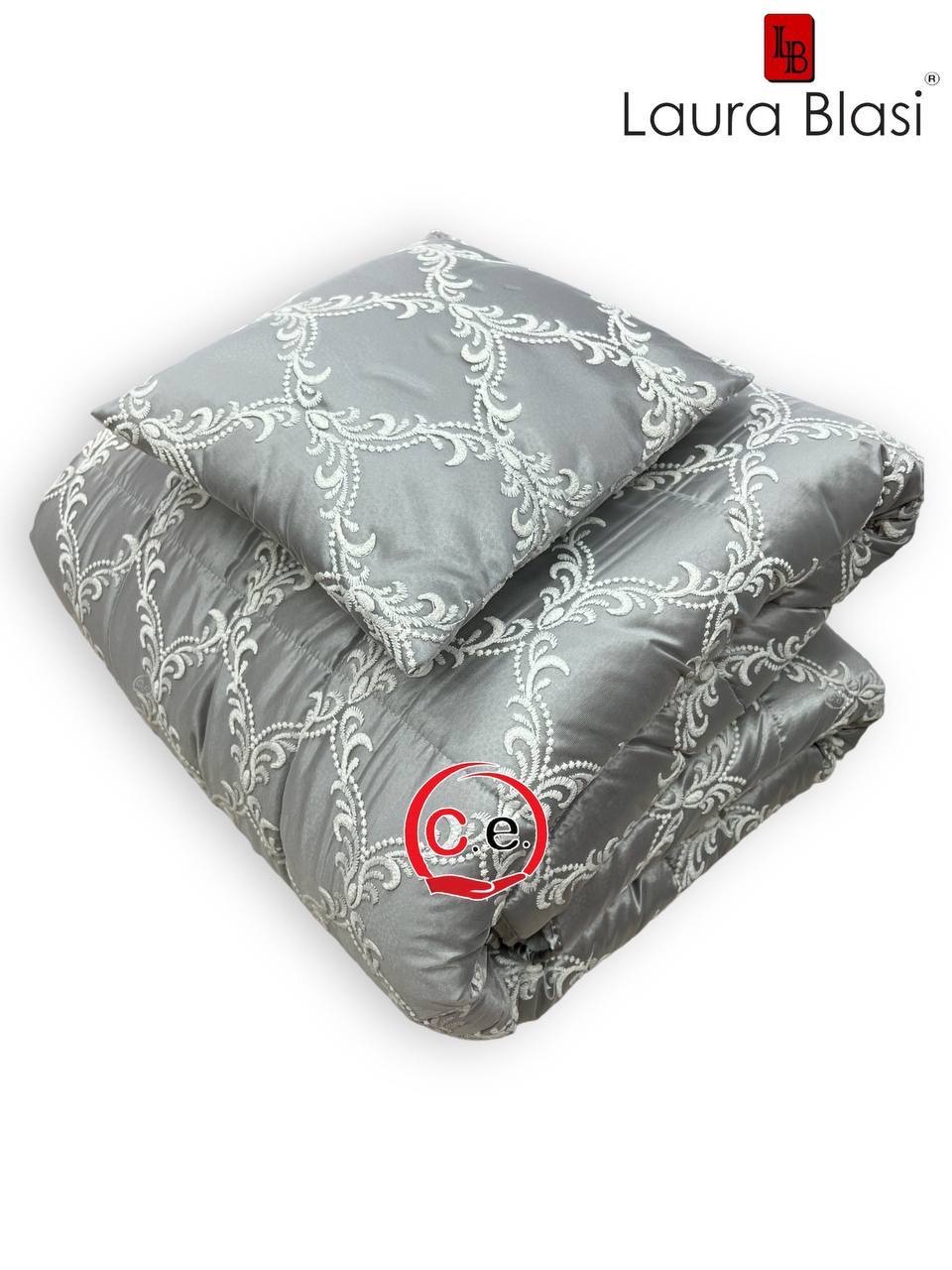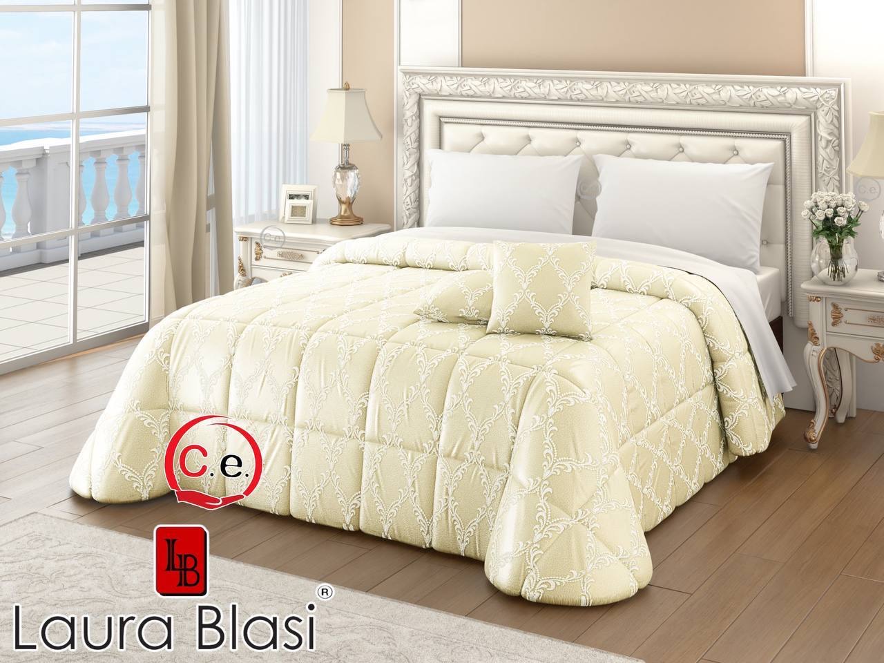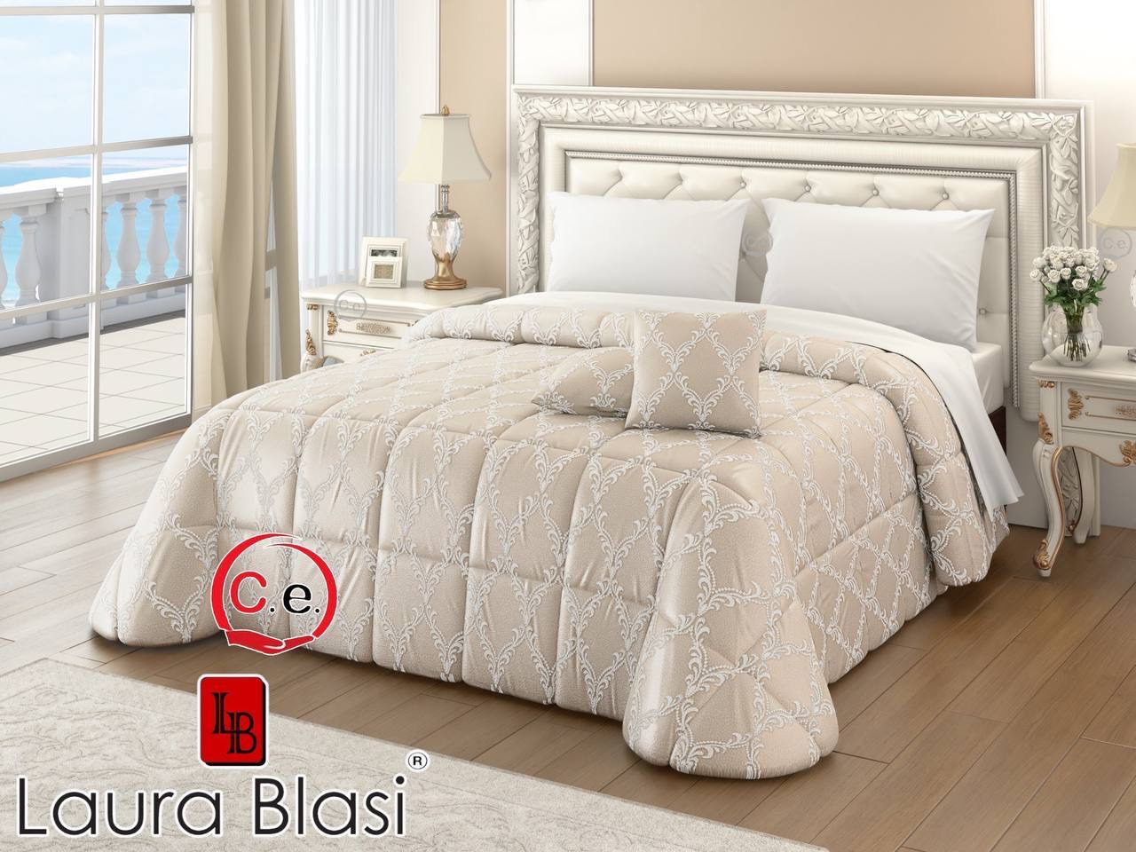 Questa trapunta presenta un tessuto in raso ricamato con 2 cuscini arredo coordinati.