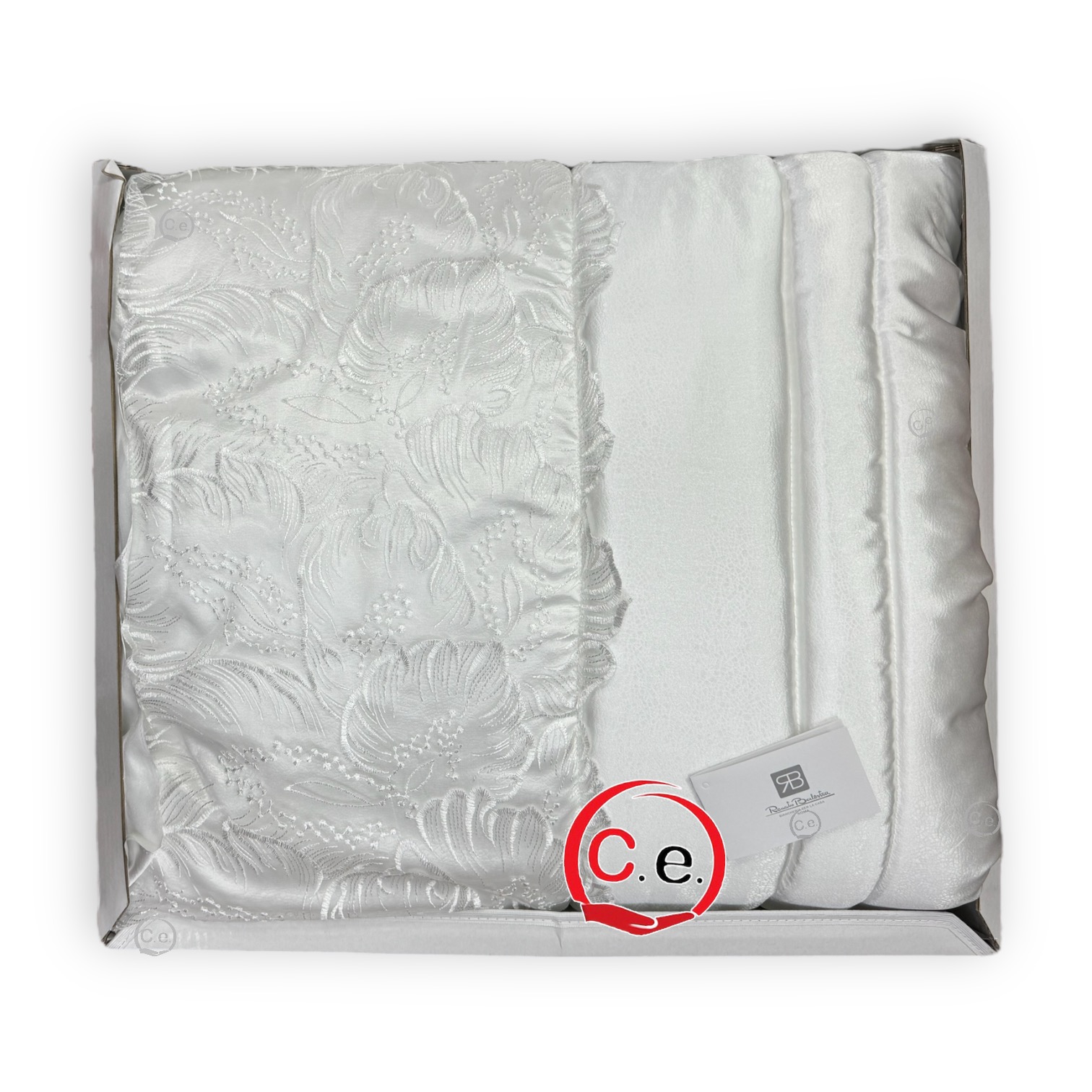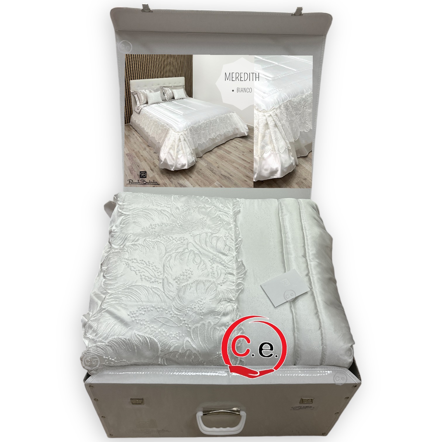 Con balza e pizzo in rebrodè, trapuntatura piazzata e 2 cuscini arredo coordinati