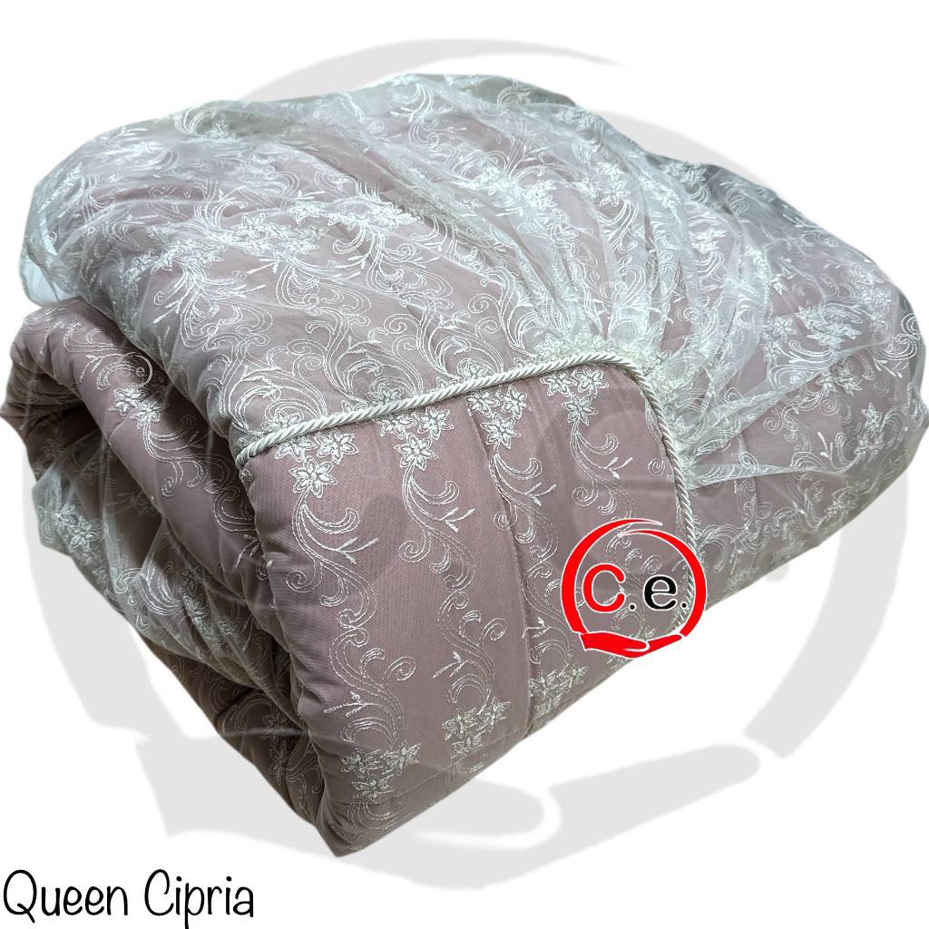 Questa trapunta presenta un tessuto in organza ricamata con 2 cuscini arredo coordinati.