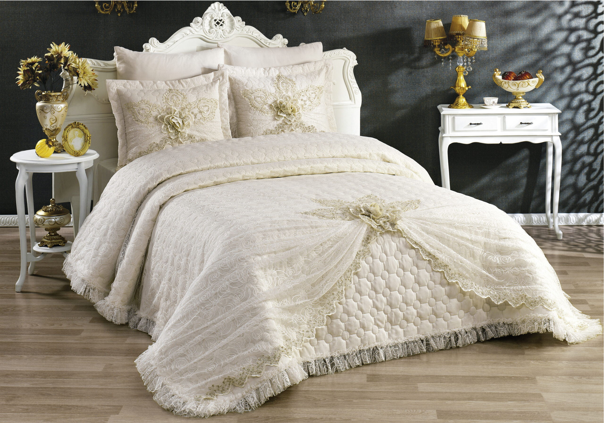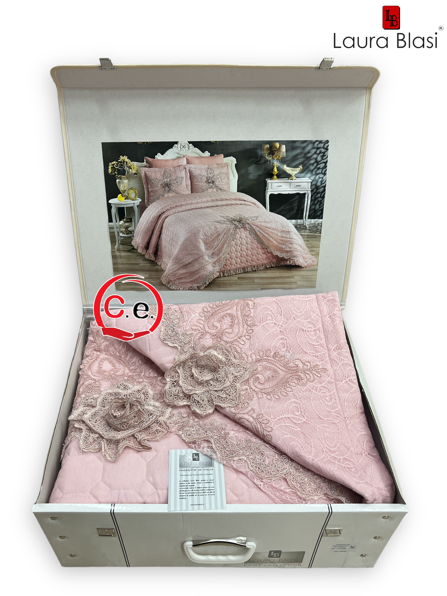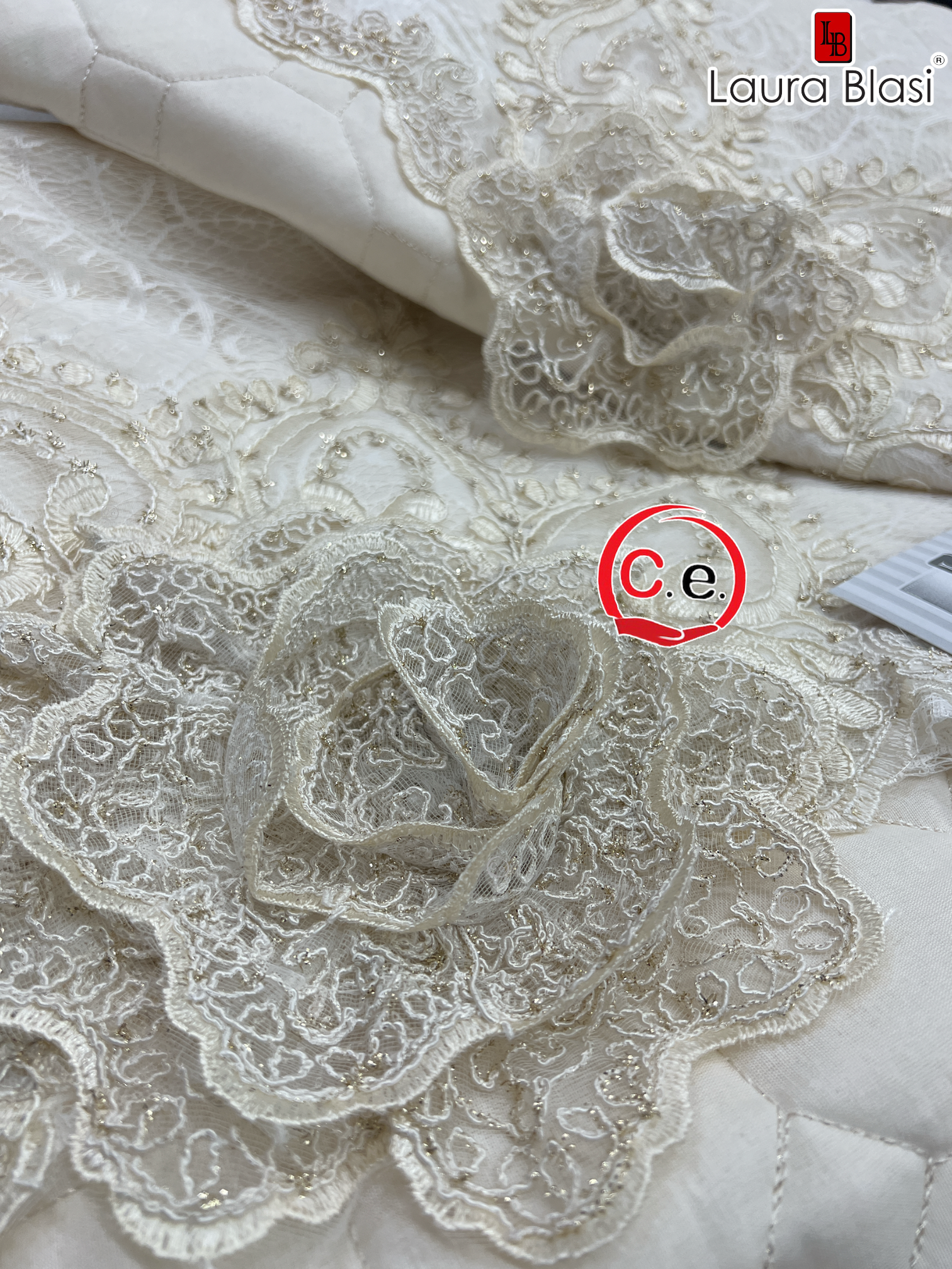 Questo trapuntino presenta un tessuto in organza ricamata con 2 federe a 3 volant arredo coordinate.