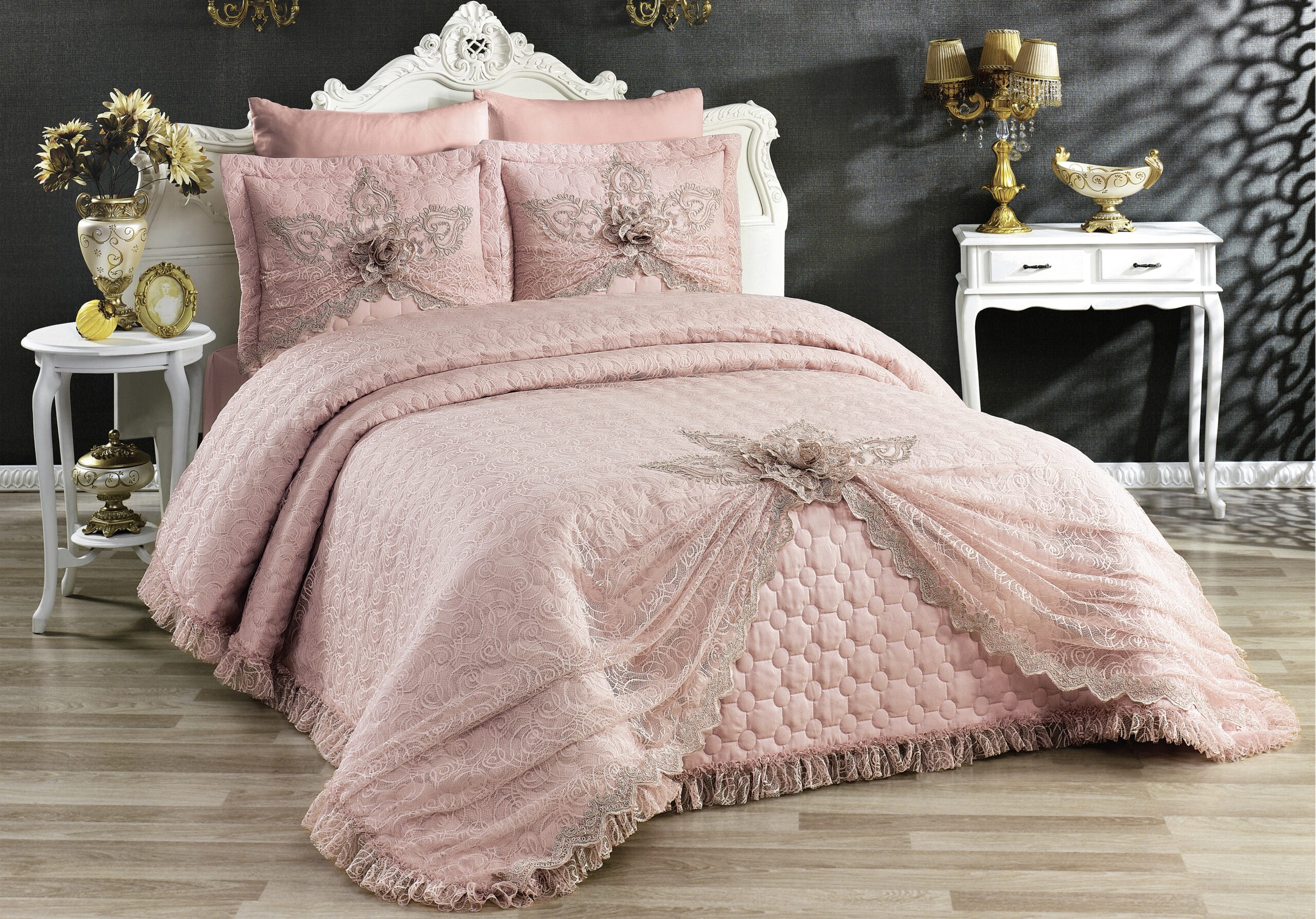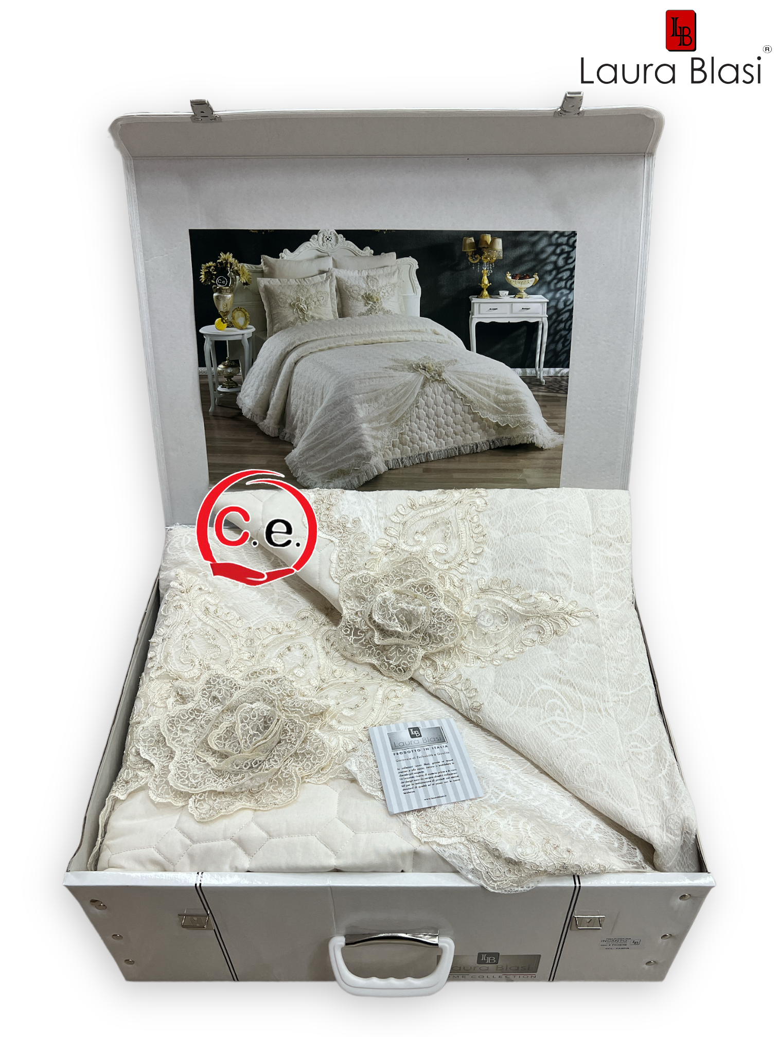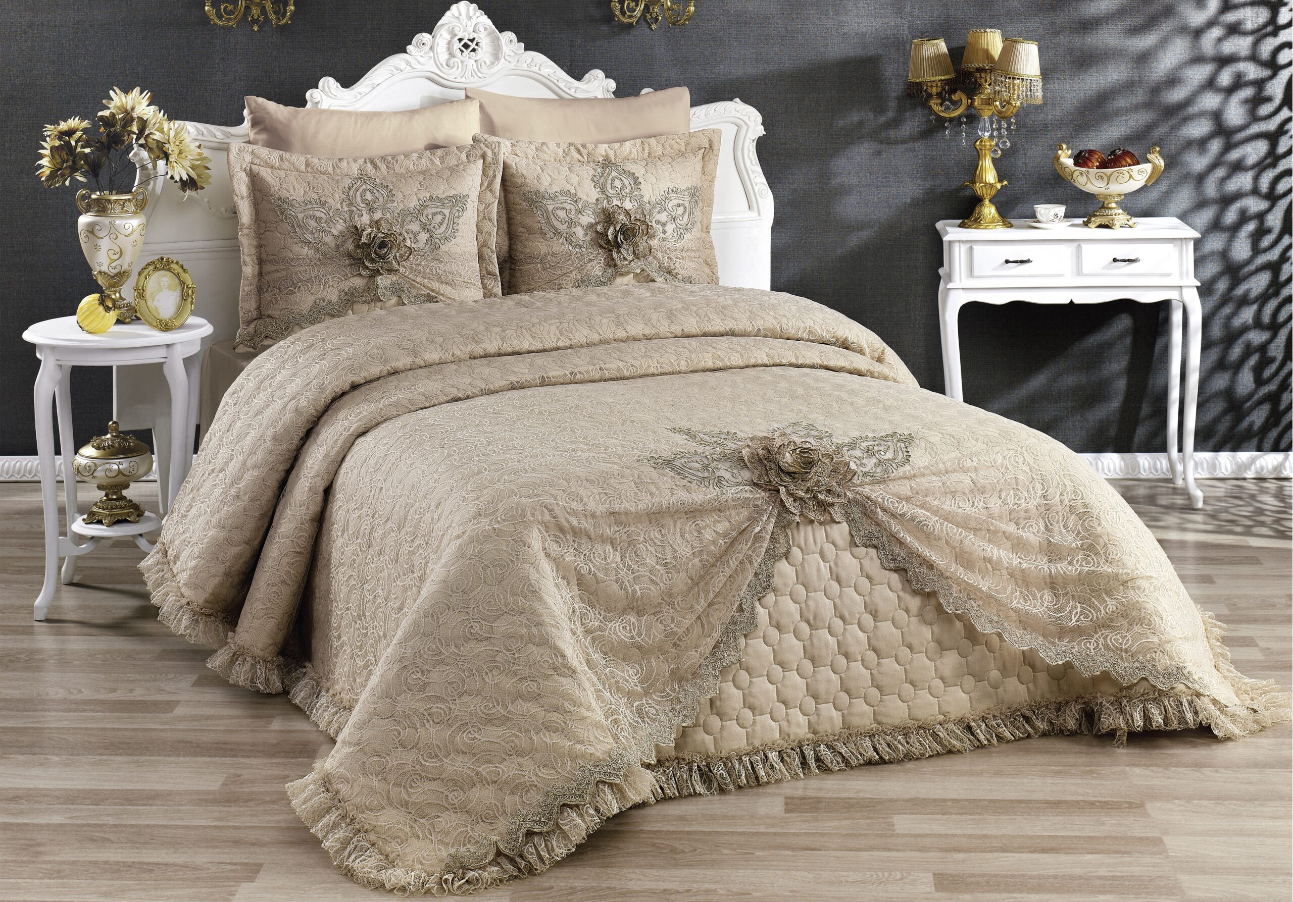 Questo trapuntino presenta un tessuto in organza ricamata con 2 federe a 3 volant arredo coordinate.