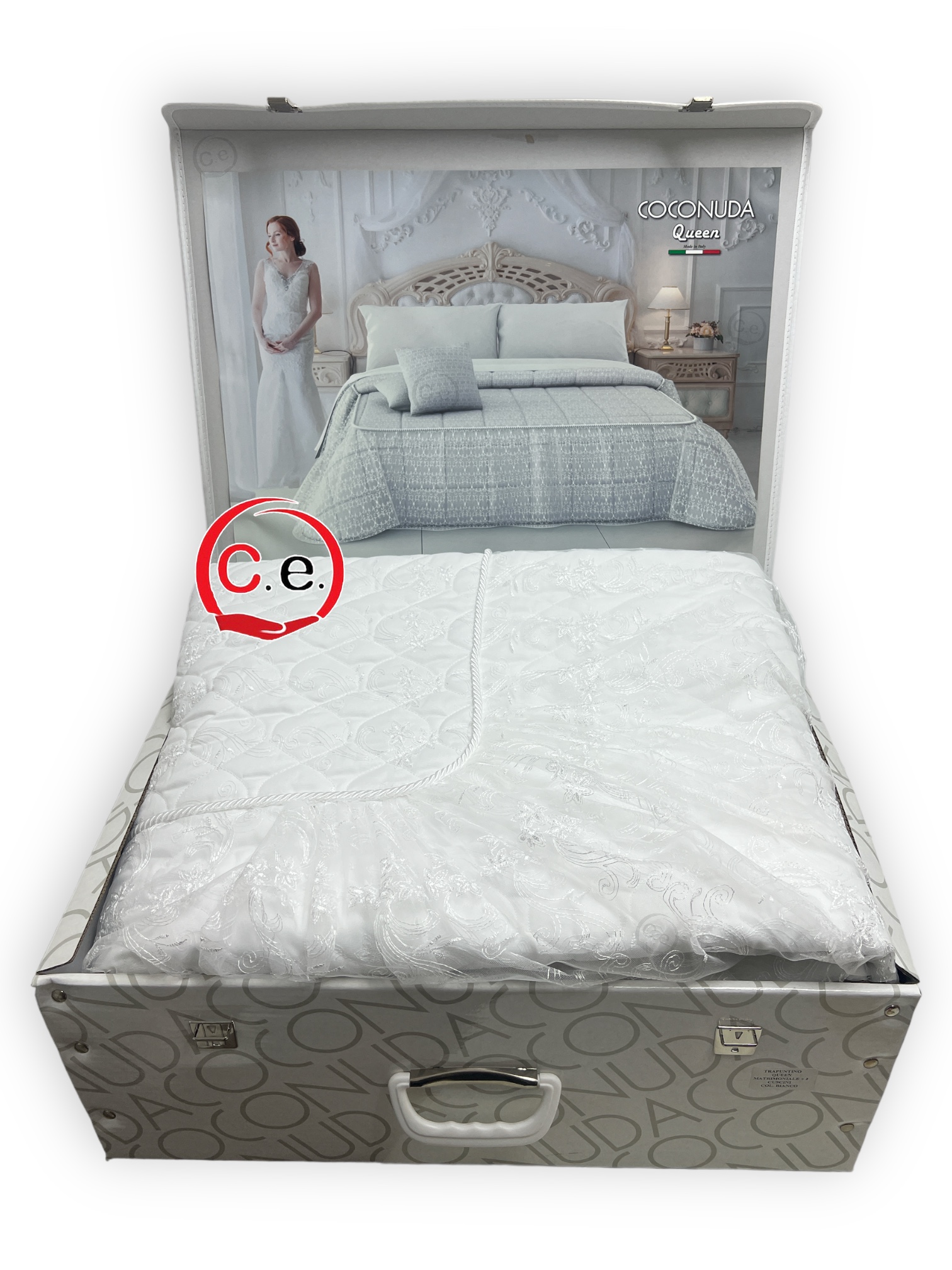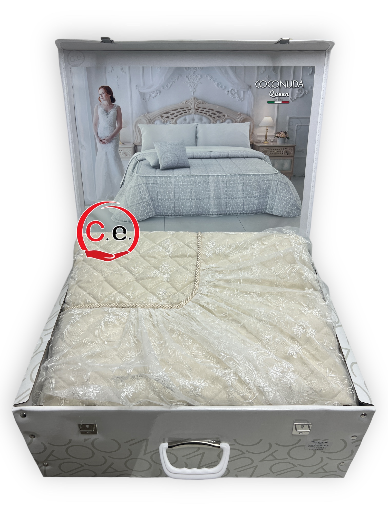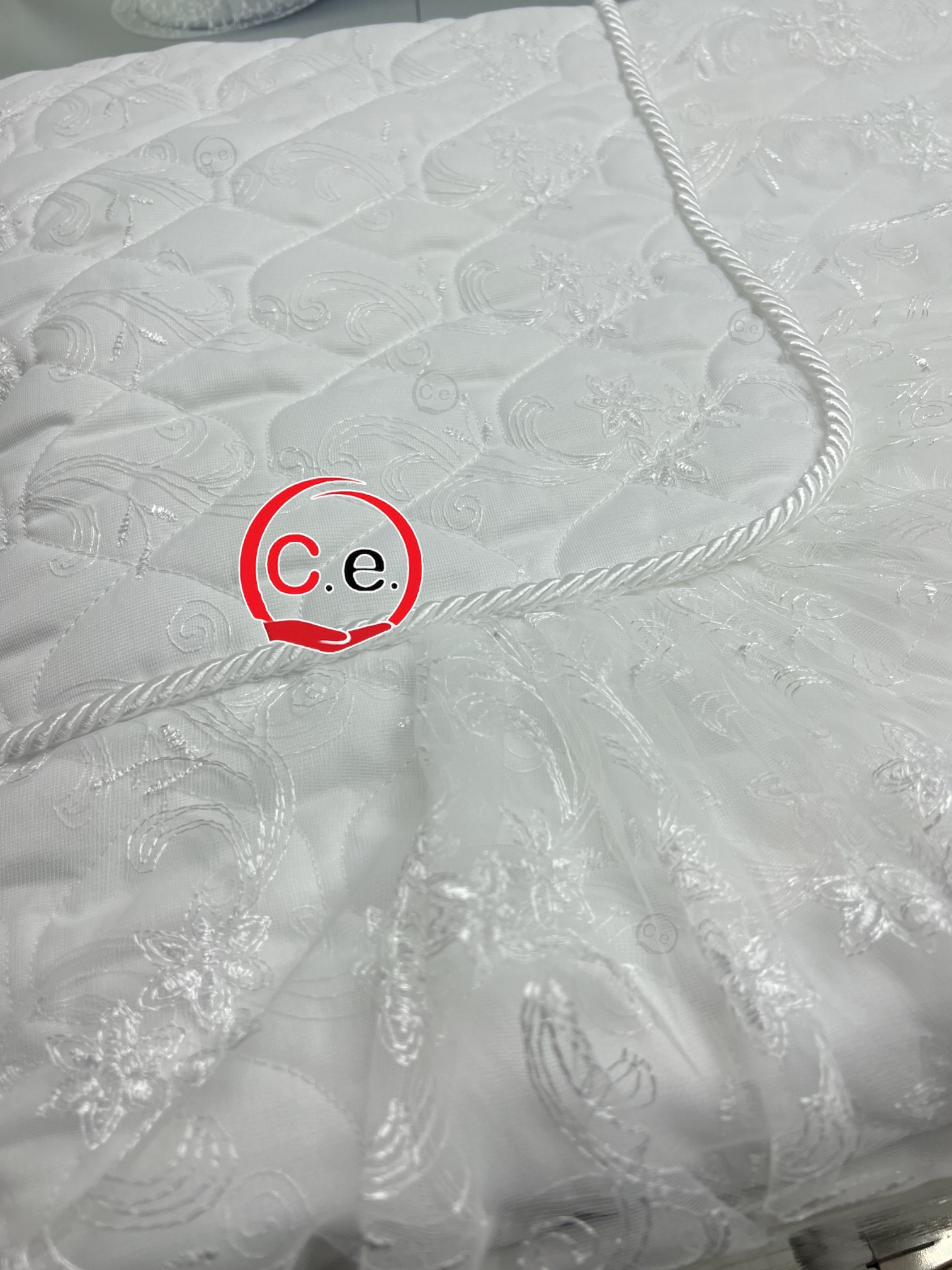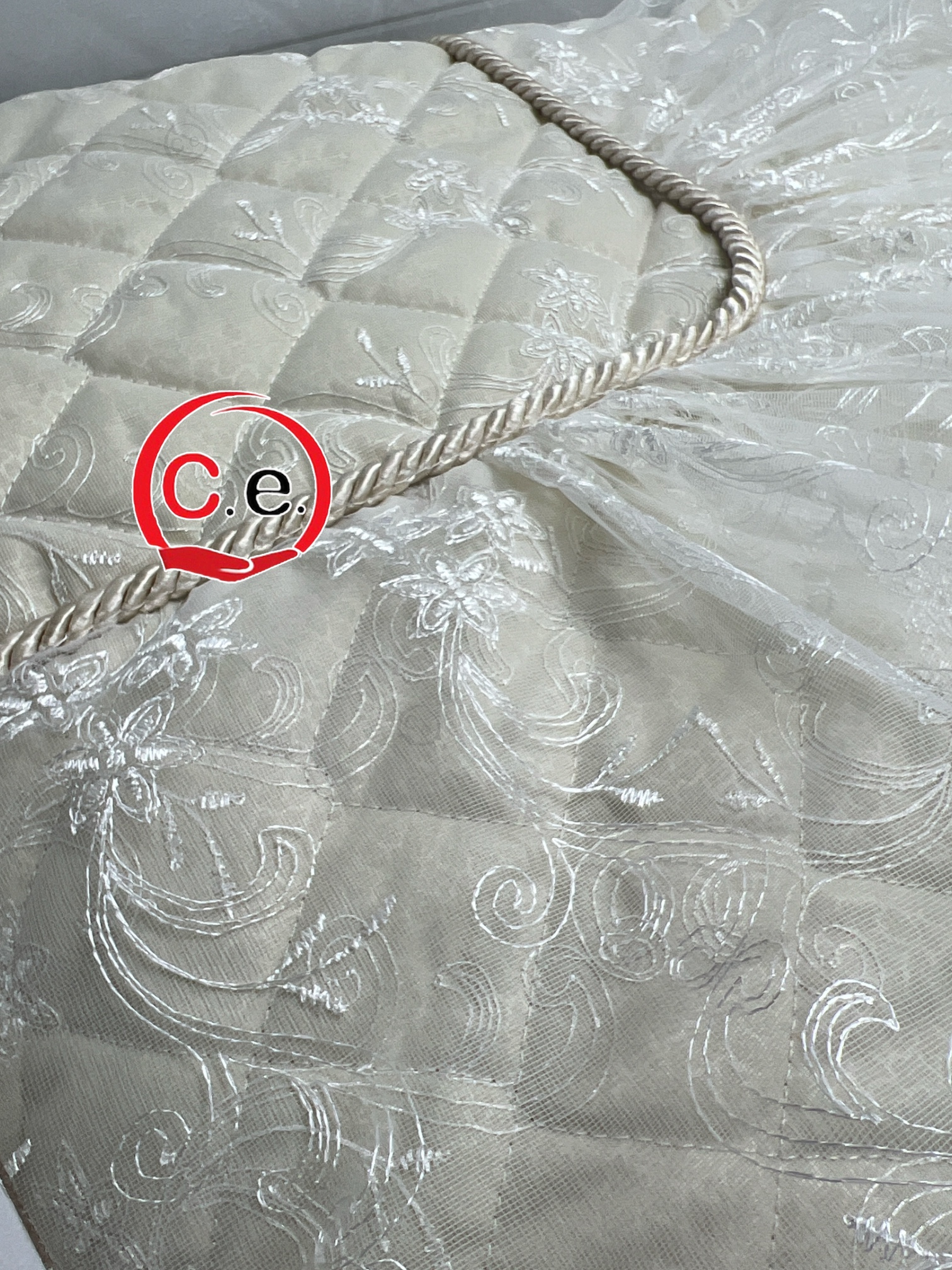 Questo trapuntino presenta un tessuto in organza ricamata con 2 cuscini arredo coordinati.