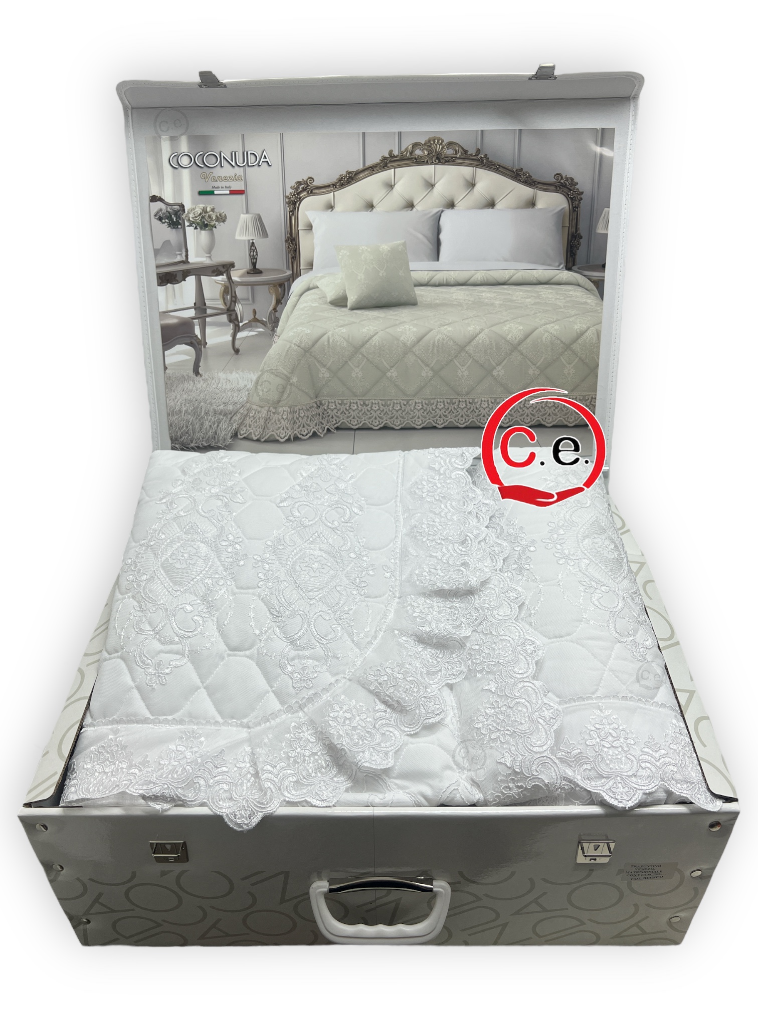 Ricamato nei minimi particolari, con pizzo rebrodè & 2 cuscini arredo coordinati